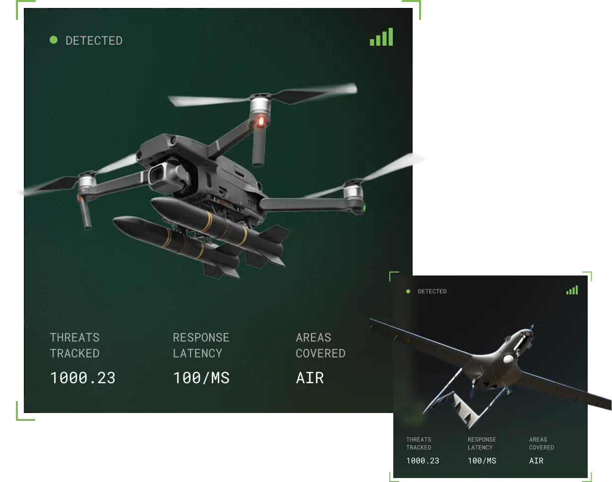 Short- and long-range coverage with radar, RF, EO/IR, and layered mitigation including jamming, spoofing, and kinetic/non-kinetic defeat. -